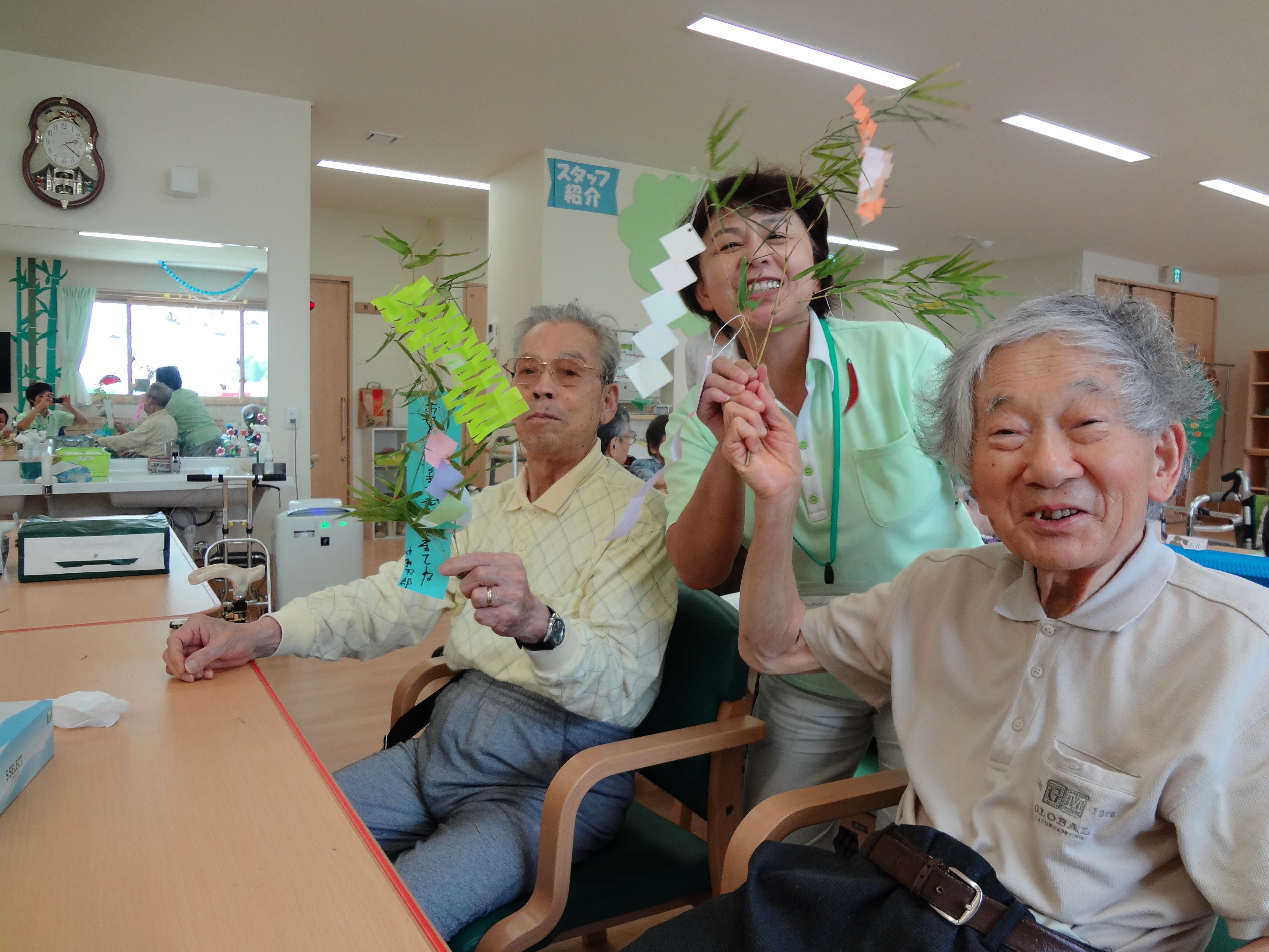 まず、皆さんに作って頂いた七夕の飾りや短冊を笹に飾り付けて頂きました。