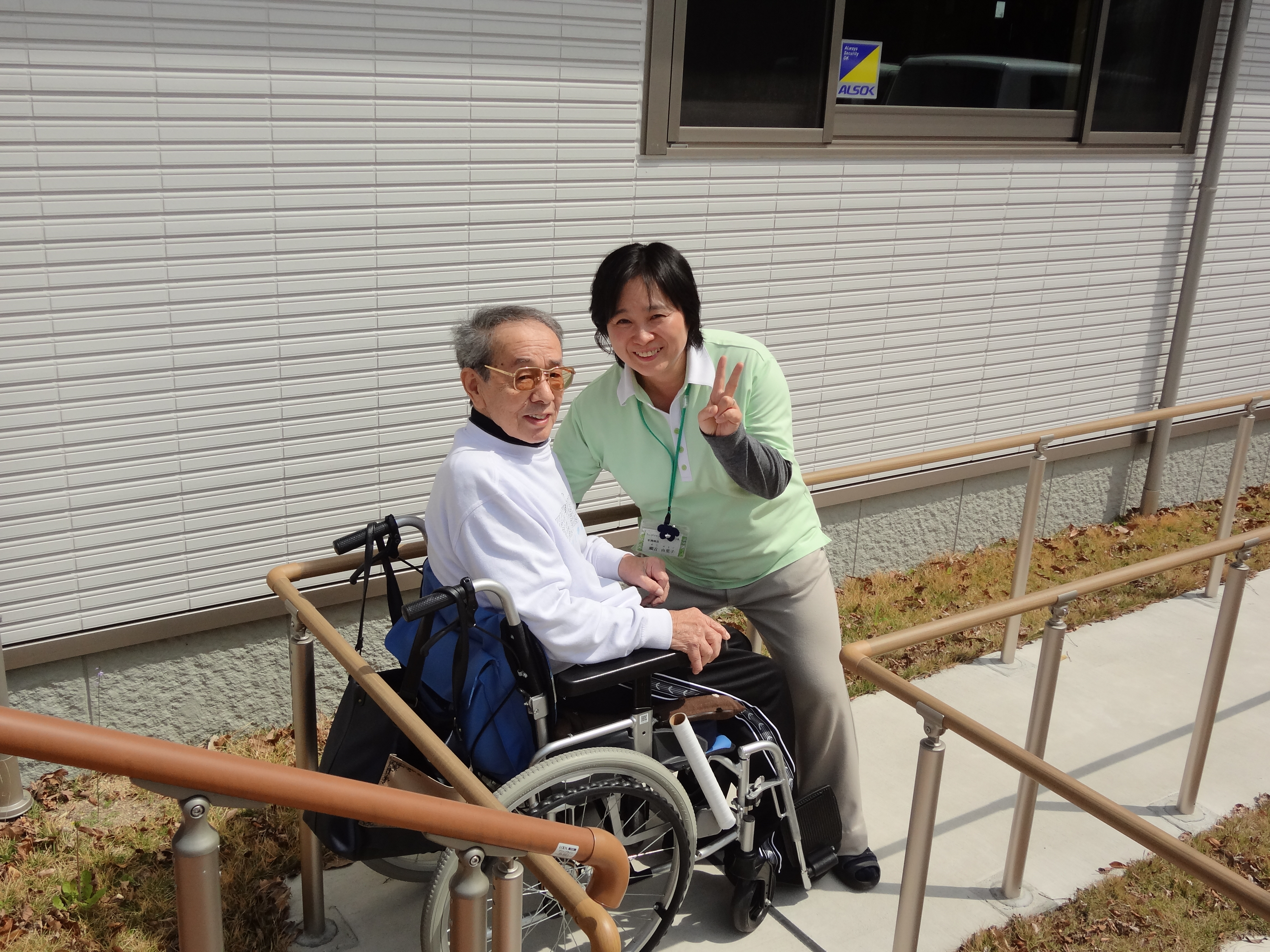 屋外での機能訓練は、屋内と気分が変わっていいですね(´∀`)♪