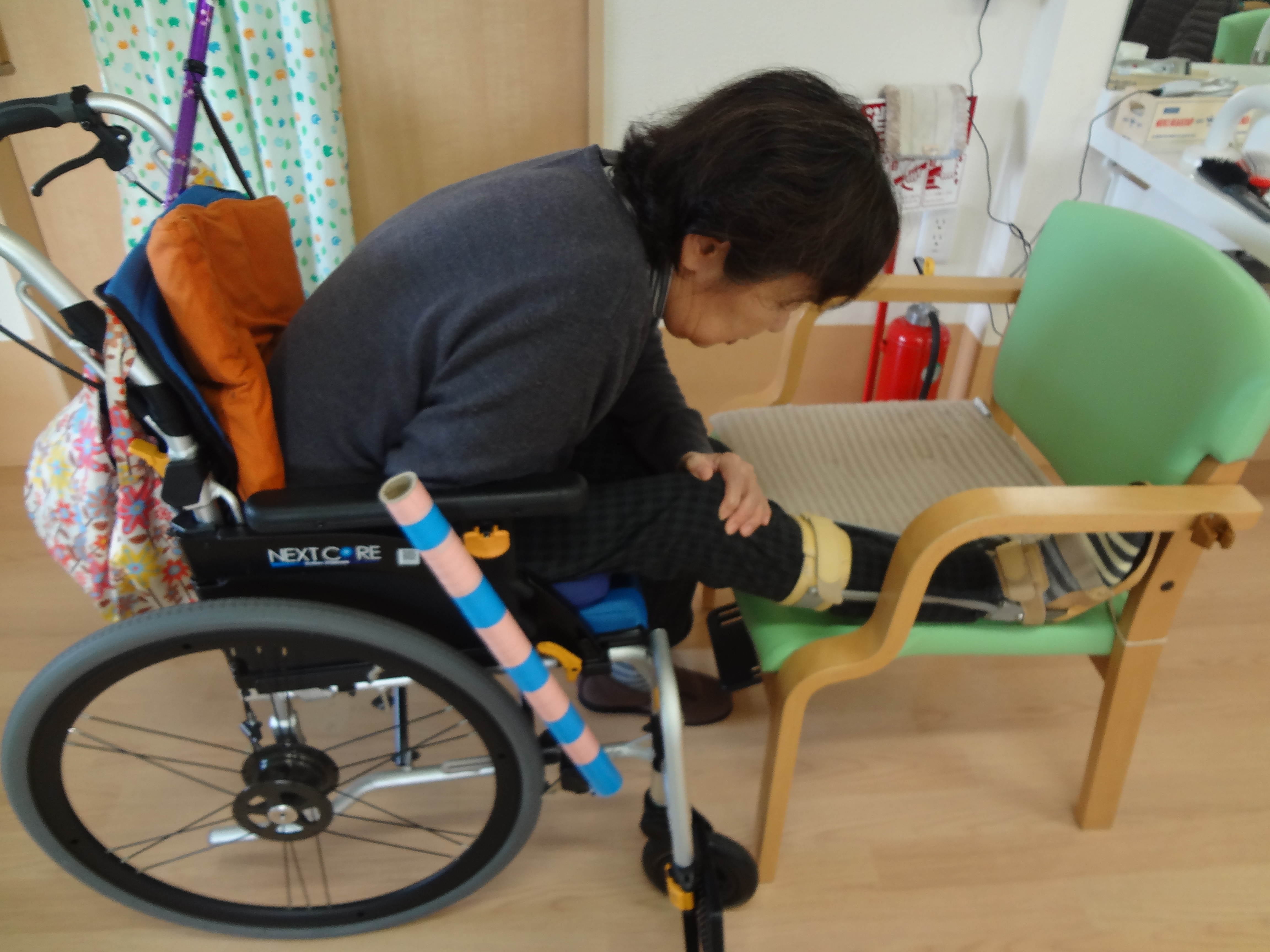 自分でできる座りながらのストレッチの紹介です。右脚の裏ももを伸ばしています。