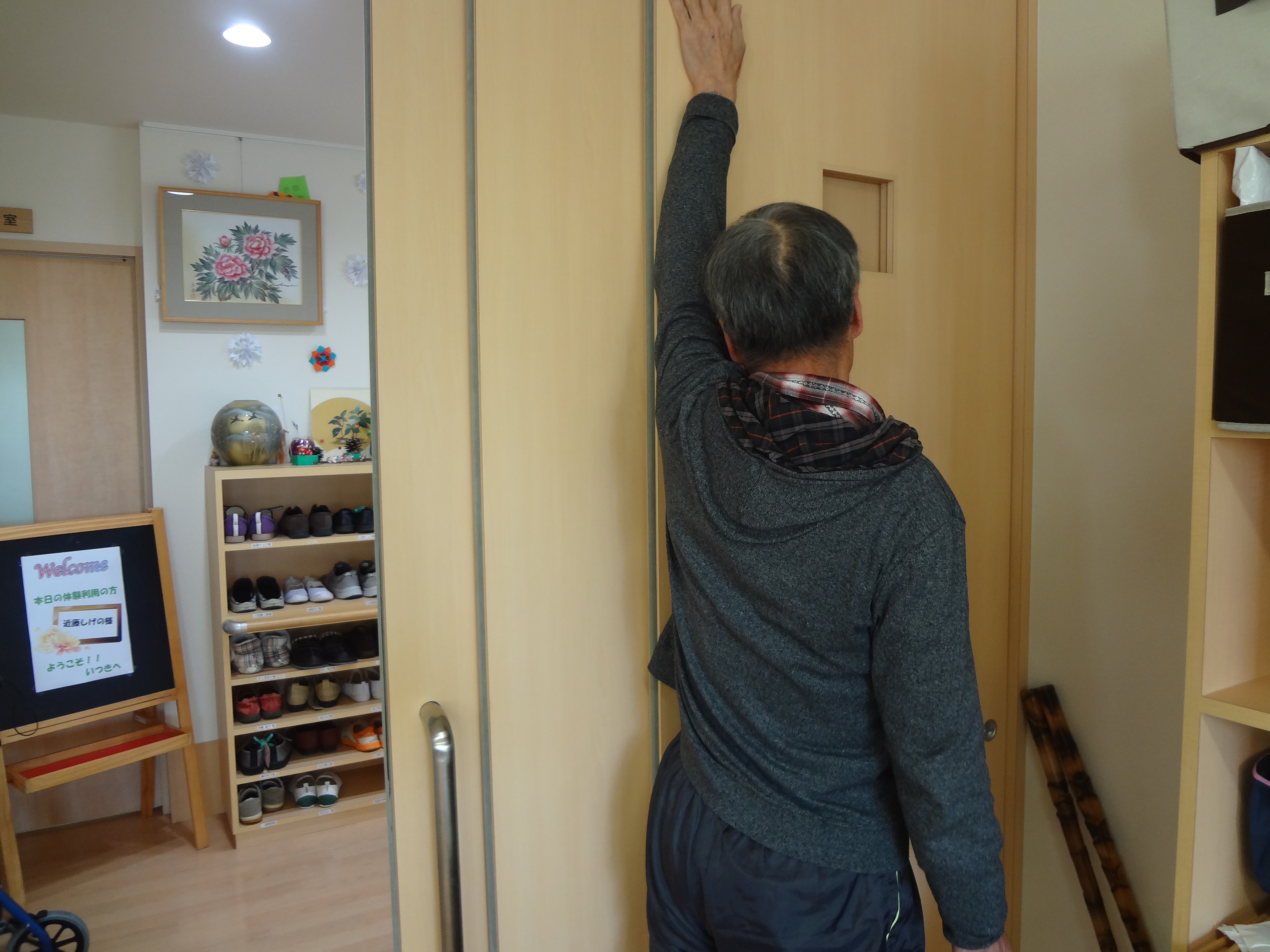 壁を利用して広背筋をストレッチしています。(^ν^)