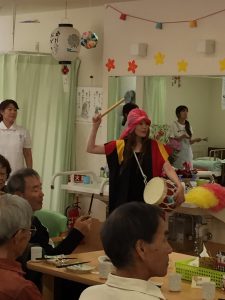 特技や、ゴム飛びを披露してくれました♡ 小学生が出てきた瞬間の皆さまの大盛り上がり(笑) 続いては、職員による沖縄民謡と太鼓でかっこよく決めます!