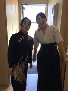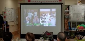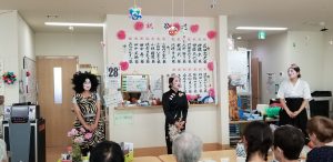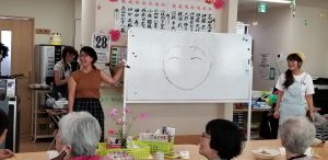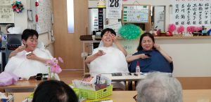 絵の得意な職員が、職員の似顔絵ゲームをしてくれました! みなさま、「あのこや!」「にてるな!」とおっしゃっていましたよ(*^_^*) 続きましては、「笑いヨガ」 ん?この白塗りの集団は誰だ!? そうです!!いつも皆さまと一緒に運動や体操をしてくれている機能訓練指導員の3人です!!(笑) 白塗り、とてもお似合いですは♡
