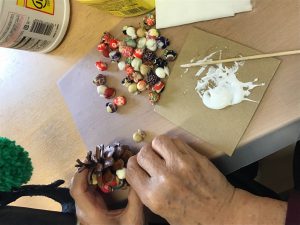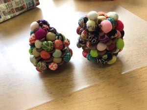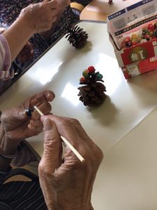松ぼっくりにボンドを付けて、布と綿で作った玉を埋めて行きます(^^)