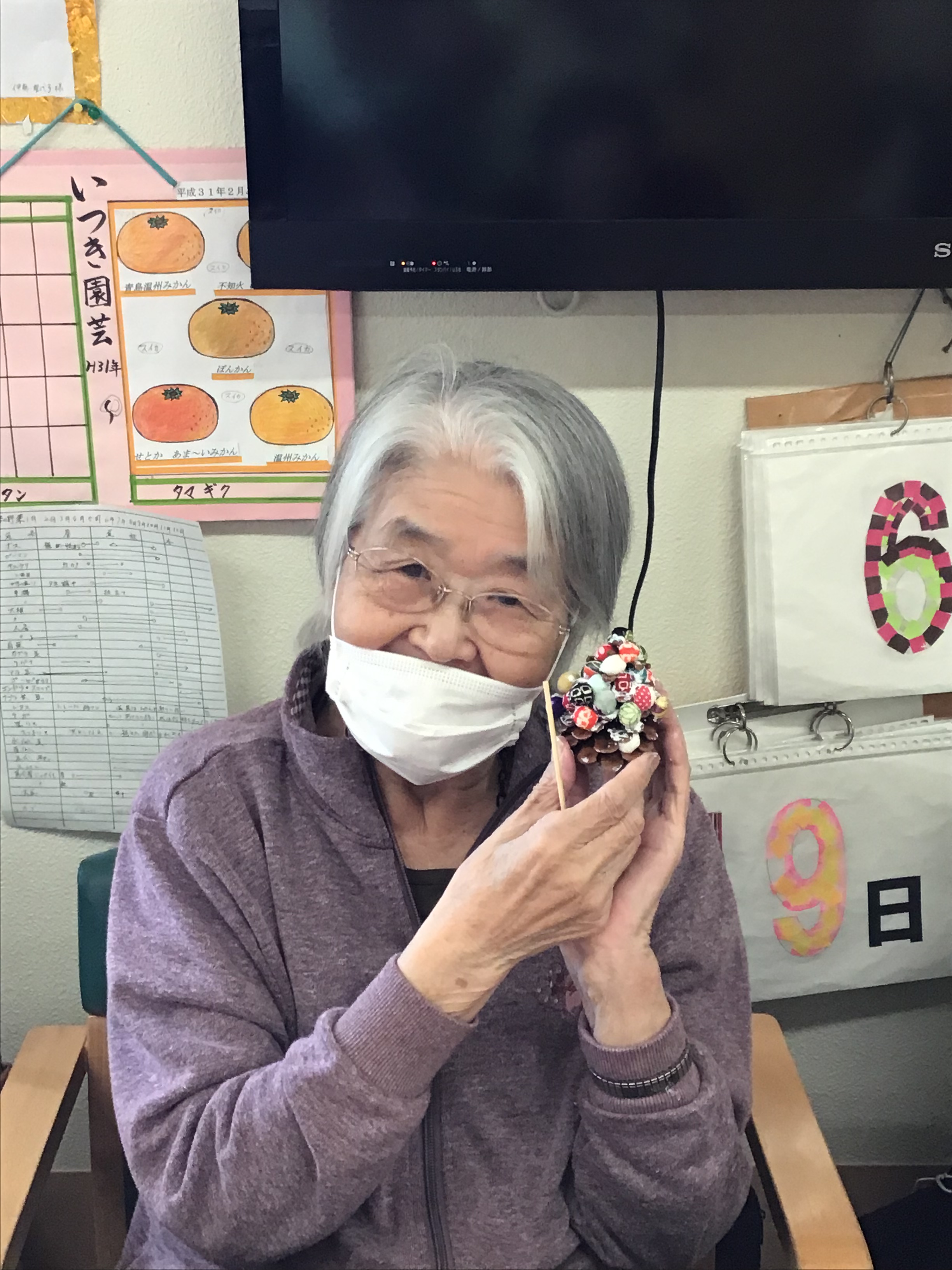 松ぼっくりにボンドを付けて、布と綿で作った玉を埋めて行きます(^^)