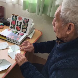 前の席の方が折り紙をされている姿を見つめていたご利用者様、