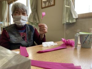 ただいま、いつきではピンクの紙でこよりを作成中~♪