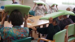 揺れがおさまるまで、頭を守ります!!