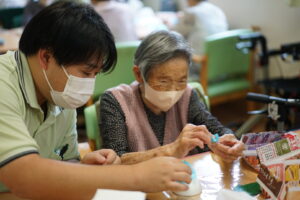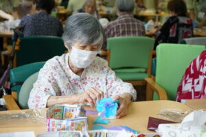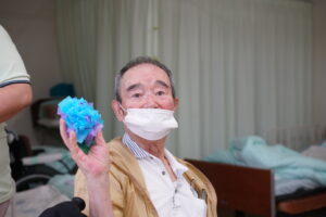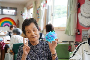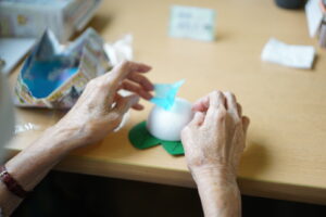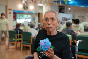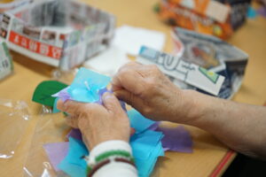 発泡スチロールで出来た半球に水色と紫色のお花紙をさしていきます♪