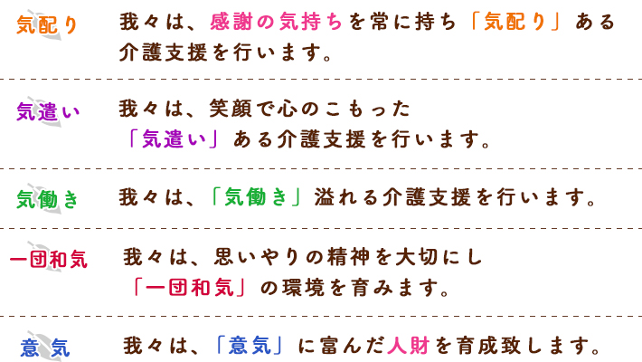 我々は、五つの『気』(樹 いつき)を大切にし、介護支援を行います。