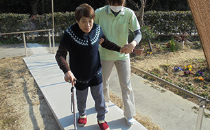 - 豊かな自然に囲まれ暖かい日差しを浴びながら、歩行訓練を行っています。